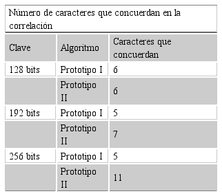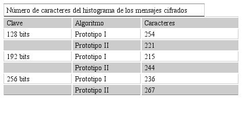 Se compararon los mensajes cifrados que fueron generados con el Prototipo I y con el Prototipo II con claves de 128 bits, 192 bits y 256 bits, los cuales se muestran en la Tabla 2.
