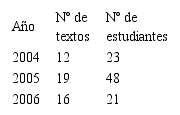 De los tres primeros años se tiene en la Tabla 1, participantes y número de textos: