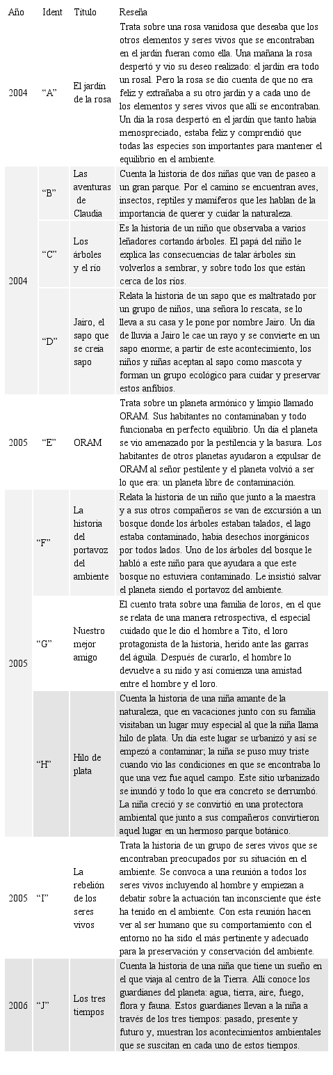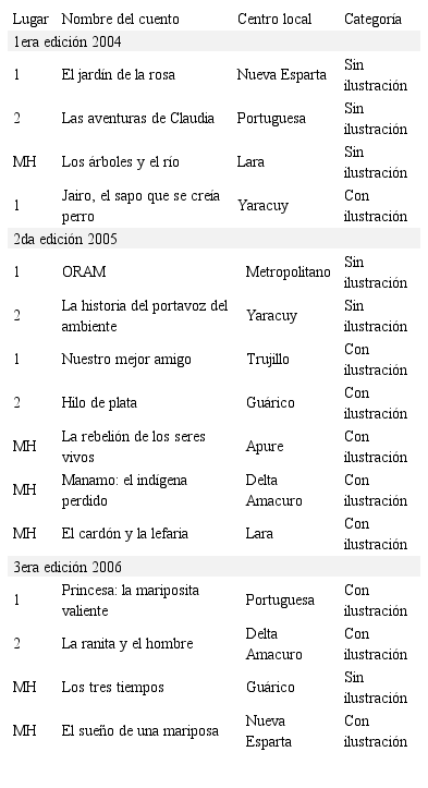 La producción literaria inédita, representada en 47 cuentos, se presenta como interesantes vehículos para captar la atención sobre los problemas presentes y potenciales que puede sufrir el ambiente. Asimismo, enaltece las potencialidades que un manejo adecuado del ambiente puede traer para Venezuela, sus ciudades y familias.