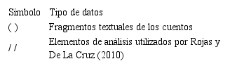 En la tabla 4, se señala la simbología utilizada en datos presentes en las categorías y en la Tabla N° 5, la distribución de la información que emergió a partir del análisis de los cuentos, realizado por los profesores Rojas y De La Cruz (2010).