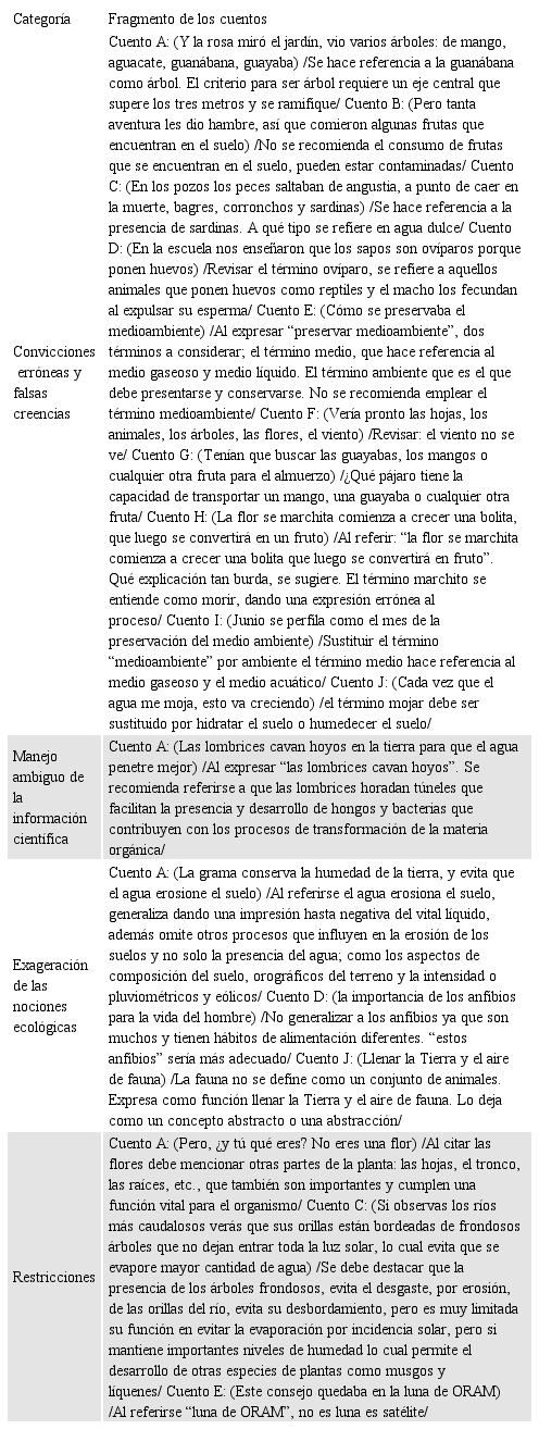 Las narraciones analizadas presentan temas interesantes sobre Ecología, pero ofrecen una falsa y distorsionada imagen sobre los diferentes elementos presentes en el ambiente, carentes de veracidad científica (ecológica), es decir, se expone un lenguaje pseudocientífico. Por ello, cada información errónea, anfibológica, exagerada y restringida que se emplee en los cuentos ecológicos, corre el grave peligro de proveer nociones equivocadas que contribuyen a una formación perjudicial de la conciencia ecológica.