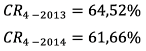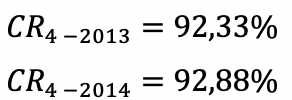 Para el segmento de venta de cigarrillos, los ratios de concentración de las 4 mayores empresas (CR4), para los años 2013 y 2014, fueron los siguientes: