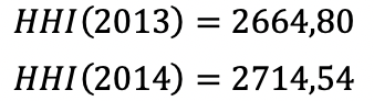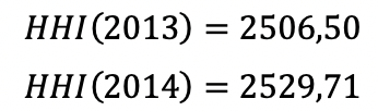Además, de las Tablas 4 y 5 se puede extraer la información acerca del valor del Índice de Herfindahl-Hirschman (HHI), que para el segmento de venta de cigarrillos en los años 2013 y 2014 tuvieron los siguientes valores: