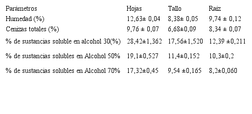 En la Tabla 1 se observan valores de humedad residual, cenizas totales y sustancias solubles, obtenidos para cada uno de los órganos de la especie estudiados.