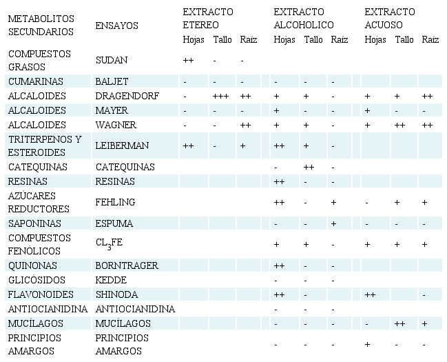 Las hojas, tomando como base los resultados obtenidos a partir de este método, son los órganos con más diversidad de metabolitos secundarios. Los resultados apuntan hacia la presencia de grasas, triterpenos y esteroides, alcaloides, resinas, azúcares reductores, fenoles, quinonas, flavonoides y principios amargos. Estos reportes concuerdan con lo reportado por (Kasoloet al, 2010) quienes mencionan la presencia de estos metabolitos secundarios. Se debe recordar que estos resultados son sugerentes, el basamento de esta técnica conduce a numerosos falsos negativos y positivos, errores de apreciación de colores y baja sensibilidad (Lock,1998).