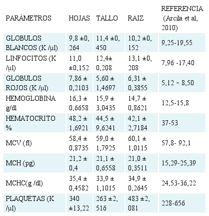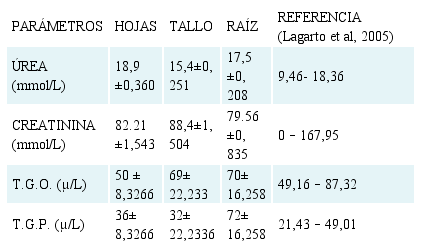 Los valores obtenidos para los parámetros hematológicos y bioquímicos que se ilustran en las tablas 3 y 4 coinciden con los parámetros normales establecidos por (Lagarto et al ,2005; Arcila et al, 2010).