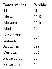 La frecuencia de edad estuvo entre 10 a 12 años, con valores expresados en la Tabla 1, calculado a partir de los datos agrupados se desprende la edad promedio de la muestra, 11 años 8 meses, con una variabilidad de 014. La edad de la mitad de los estudiantes se cuantificó por debajo de los 11 años 6 meses, es decir con una diferencia menor de dos meses. La asimetría estuvo por encima de la mediana y la Curtosis por debajo de la misma, tal como se aprecia en la Figura 1.