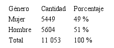 Una vez descritos los datos de frecuencia de edad de la muestra se procedió a analizar la información obtenida en relación al género de la muestra. En la Tabla 2 se representa la frecuencia estadística de género que se obtuvo como resultado del análisis de datos, donde 5449 son mujeres, equivale al 49% del total de la muestra y 5604 son hombres, esto es 51%. Valores que son representados en la Figura 2.