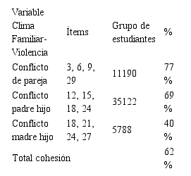 Clima familiar: Para medir esta variable violencia intrafamiliar se utilizó la Escala de clima familiar de Moos y Moos (1981), compuesto por 30 ítems, que permiten medir la cohesión, expresividad y conflicto. El ítem “mis padres nunca están y cuando están pelean frecuentemente” permitió evidenciar la variable violencia intrafamiliar. Los índices de fiabilidad en otros estudios han sido muy satisfactorios, al igual que la validez de los ítems que permiten medir las variables descritas en el clima familiar.