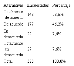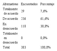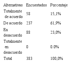 La Tabla 1 muestra que 46,2% (177) y 38,6% (148) de los encuestados está totalmente de acuerdo en utilizar un medio de pago a través de un dispositivo celular (Cevallos Zambrano, 2014), mientras que 7,6% (29) está en desacuerdo.