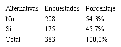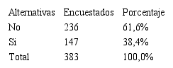 El 61,9% (237) de los encuestados No posee cuentas (de Ahorro o Corriente) en alguna Institución Financiera, mientras que el 38,1% (148) respondió que Sí. Ver Tabla 6.