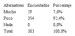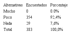 En la Tabla 5 se evidencia que del total de entrevistados, 92,4% (354) respondió que la información emitida acerca del Sistema de Dinero Electrónico ha sido Poca; por otra parte, el 7,6% (29) asegura no haber recibido información sobre este tema.