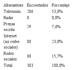 En este estudio, se evidencia que el principal medio de comunicación que le ha servido al encuestado para adquirir conocimiento sobre el Sistema de Dinero Electrónico es la Televisión, representando el 53,8% (206) de la muestra; luego internet 23% (88), seguido de las redes sociales 15,7% (60), y 7,6% (29) orientado por medio de la prensa escrita. Cabe destacar que ninguno ha utilizado la radio como medio de información sobre esta temática. Ver Tabla 4.