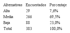 En su mayoría, 69,5% (266) de los entrevistados categoriza como Media, al nivel de confianza que tienen respecto a la seguridad que brinda el Sistema de Dinero Electrónico; Apenas el 7,6% (29) lo ubica como Alta. El resto (23%) lo considera como Baja. Tabla 8.