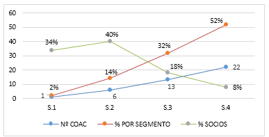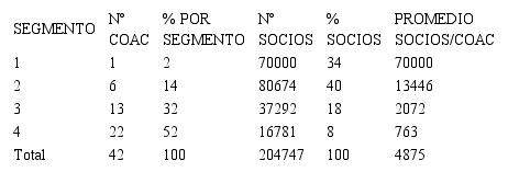 Las cooperativas estudiadas tienen 204.747 socios, distribuidos en más de una provincia, en especial las instituciones de los segmentos 1, 2 y 3. La información no fue posible desagregarla por género ya que 53% de COAC no completaron el dato al respecto. Además, el segmento 1 representa el 34% del total de socios y el 2% de los establecimientos; el segmento 2 el 40% de los socios y el 14% de los establecimientos, el segmento 3 y 4 el 26% de los socios y el 84% de los establecimientos (Tabla 3).