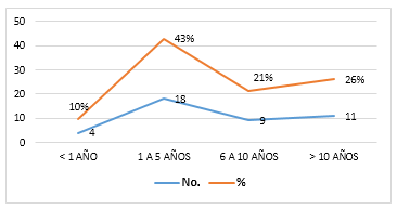 El 43 % de los/las gerentes registra un promedio de 1 a 5 años de experiencia al frente de la organización, el 26% más de 10 años, se encontró un caso interesante de un Gerente que supera los 30 años de experiencia y permanencia en la cooperativa; el 21% de 6 a 10 años y el 10% menos de 1 año, esto a diciembre (2014). La experiencia permite alcanzar liderazgo y control del poder, por ello una permanencia larga y con resultados es legitimada por sus respectivas asambleas de representantes y consejos. La LOEPS limita la permanencia de los dirigentes por un máximo dos periodos consecutivos.