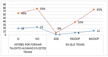 En relación al interés por capacitarse en temas de gestión social, lo preocupante es que el 55% de las COAC no tiene interés en la aplicación de éstas u otras metodologías, que se acoplen a su sistema de gestión, su prioridad es lo financiero, pero el 45% sí tiene interés en el tema. De este último porcentaje, el 63% quiere perfeccionar su conocimiento del BSCoop en aspectos que más les atrae, por ejemplo el cumplimiento de la Ley o control de la SEPS y el 32% en RSCoop. Por lo tanto los organismos de integración, la SEPS y la academia, deberán jugar un rol motivador para formar Talento Humano bajo estas perspectivas.