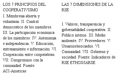 Las empresas cooperativas deberían efectuar una gestión socialmente más responsable y tendiente a profundizar su propia naturaleza solidaria, mediante la medición y profundización de los 7 principios del cooperativismo, en un sentido más amplio, y complementado con las 7 dimensiones, que dan forma a la Responsabilidad Social, los cuales se resumen en la Tabla 1.
