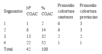 El Segmento 1 tiene una cobertura promedio en 6 cantones de 3 provincias, el promedio del segmento 2 es igual; el segmentos 2 está en 2 cantones y 2 provincias, en tanto que la presencia territorial del segmento 1 está dispersa en un solo cantón y en una sola provincia. (Incluye cada segmento la oficina la matriz). Es fundamental señalar que en plena veda para la apertura agencias o sucursales, si se inauguraron oficinas o sucursales.