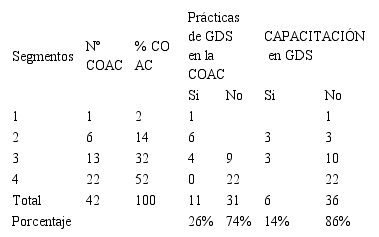 Conoce el tema de la Gestión del Desempeño Social GDS solo el 14% de las COAC. Por ello el 74% no efectúa acciones relacionadas con la aplicación de la metodología. El 24% señala que sí, pero se refieren a prácticas de atención al socio, mejoramiento de la calidad de vida de su Talento Humano o la realización de estudios de pobreza y auditoría social, efectuadas por la Red Financiera Rural –RFR, que sí guardan relación con el tema. En general a las prácticas declaradas al respecto no corresponden a los estándares antes mencionados.