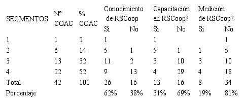Al respecto el 62% de las COAC conoce que significa la RSCoop, el 31% capacitó a su talento humano con miras a mejorar la gestión social de la cooperativa. Solo el 19% realizó acciones muy focalizadas al respecto, en el campo ambiental, gobierno cooperativo, laboral, con la comunidad. Otras creen que el tema se relaciona con el apoyo a eventos festivos en sus territorios de influencia o con rifas para los socios con premios como: autos, electrodomésticos, computadoras, entre otros; pero ninguna ha introducido la metodología de manera sostenida. Pocas cooperativas como la CACPECO de Latacunga, anualmente presenta un informe de sostenibilidad de RSCoop.