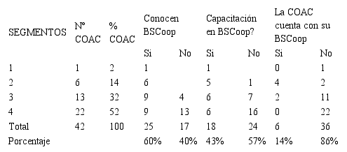 Sobre el tema, el 60% de las COAC conocen lo que significa el BSCoop. De dicho porcentaje el 43% se capacitó con el auspicio de los organismos de Integración Cooperativa o en los eventos organizados por la SEPS u organismos de integración. Solamente el 14% efectuó ya su BSCoop con la metodología de la ACI y una con la DGRV, desde el año 2012, con lo cual conocieron en detalle algunas características del impacto social que generan. La SEPS difundió los resultados del BSCoop del sector en eventos internacionales, pero en el primer resultado de la aplicación del modelo del organismo de control Páez (2014, p 77) sostiene que “(…) la información recibida, si bien es cierto no es muy halagüeña, complica la extrapolación a la totalidad del cooperativismo y dificulta poder afirmar no está bien como se esperaba (…)”.
