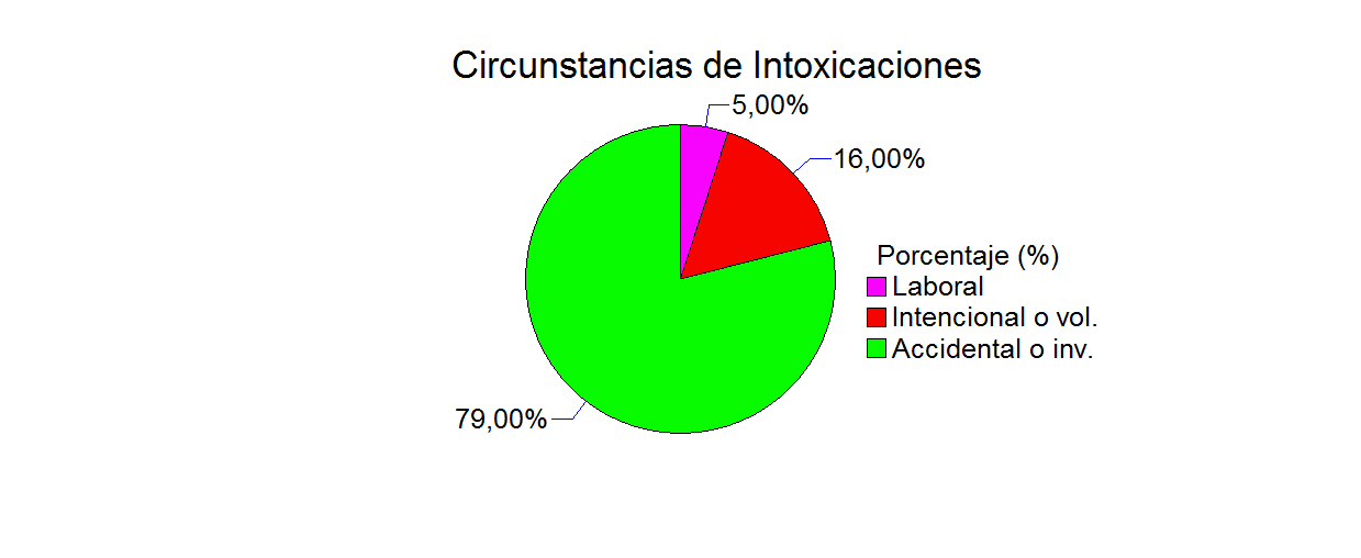 Con respecto a las circuntancias de las intoxicaciones de tipo intencional, se encuentran; 89% problemas familiares, 9% problemas de salud mental (depresión), 1% problemas escolares y laborales y 0,1% abuso sexual. La procedencia del interlocutor; 86% Unidad de Salud, 10% domicilio, 3% CIATOX y 1% Lugar de trabajo. En la clasificaciónn de intoxicaciones según el tipo de agente por su uso, los 4 principales son: 49,2% plaguicidas, 16,6% medicamentos de uso humano, 10,1% productos de uso domésticos y 7,0% productos de uso industrial.