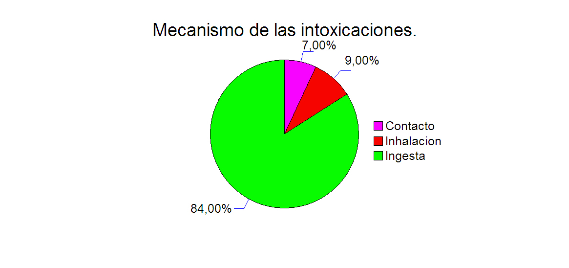 En cuanto a los mecanismos de intoxicación, los registros más elevados son aquellos ocurridos por ingesta (84,62%). Ver Figura 7. Existiendo una similitud con el estudio de Ribeiro (2012), que indica que el mecanismo de intoxicación más frecuente es la oral con 96%.