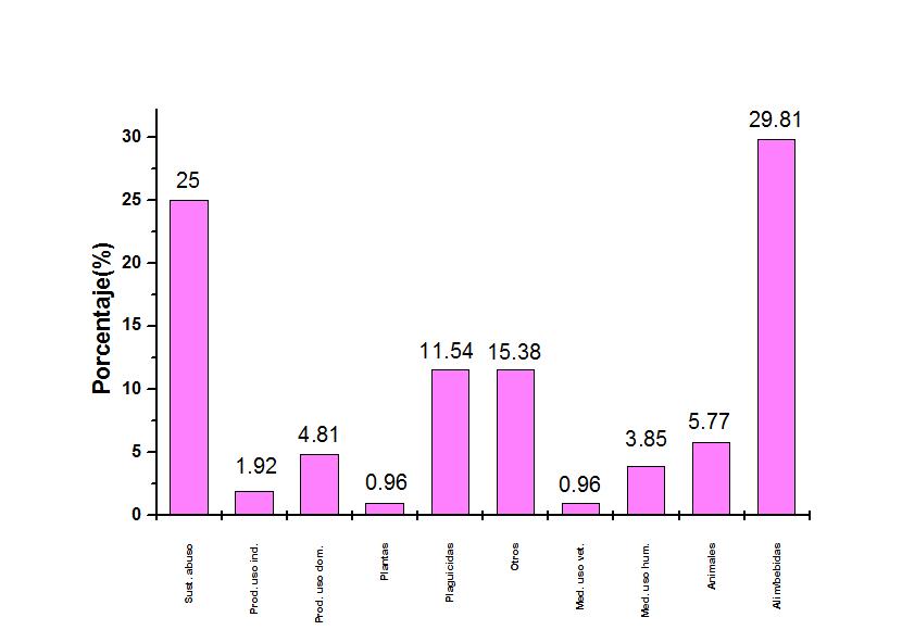 A nivel nacional, durante el año 2012, el CIATOX indica que los plaguicidas predominan con 46,6%, seguido por los medicamentos de uso humano con 16,6%, productos de uso doméstico 11,2%, productos de uso industrial 7,4% otros 4,2%, animales 3,3%, sustancias de abuso 2,2%, los alimentos/bebidas 1,2% y los medicamentos de uso veterinario con 0,1% (CIATOX, 2012).