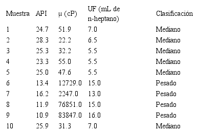 La Tabla 1 muestra las características obtenidas para las 10 muestras de petróleo crudo utilizadas en la investigación, seis de ellas clasificadas como medianas y cuatro como pesadas según lo establecido en la tabla de clasificación API (León, 2013).