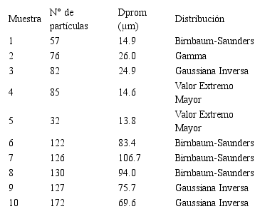El resto de las muestras se sometieron al mismo análisis y los resultados se muestran en la tabla 2. De forma general, se obtuvo que el comportamiento de los tamaños de partícula promedio de agregados, no se ajusta a la distribución Normal. La distribución Gaussiana Inversa fue la que se ajustó al mayor número de muestras (4 en total), seguida por la distribución Birnbaum-Saunders con 3 ajustes, continuando con la distribución Valor Extremo Mayor con 2 ajustes y la distribución Gamma con un ajuste. Hay que tener en cuenta que estas distribuciones fueron las que mejor se ajustaron según parámetros de comparación la Verosimilitud Log y un Valor-P superior a 0.05, es decir, con un nivel de confianza del 95%.