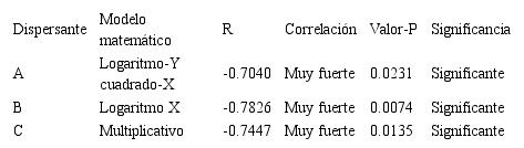 Se observa en la tabla 4 que no hubo ajuste de los datos a un único modelo matemático, destacando que para cada dispersante se estableció un modelo diferente. Los INE de los tres dispersantes mostraron correlaciones negativas, siendo entonces la relación entre las variables de tipo inverso. Según Hopkins (2014), la correlación en todos los casos fue muy fuerte, por lo que se puede decir que si existe una asociación entre el tamaños promedio de los agregados de asfaltenos y las eficiencias de los productos utilizados basadas en el factor INE. Esto se complementa con el Valor-P de la tabla ANOVA, que en todos los casos fue inferior a 0.05, lo que indica que existe una relación estadísticamente significativa entre las dos variables correlacionadas.