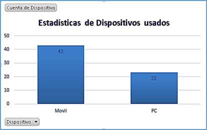 El mayor número de dispositivos usados fue de 43 teléfonos celulares, frente a 23 usuarios que accedieron desde una PC. Véase Figura 8. Por lo tanto, el mayor número de usuarios accedió desde un dispositivo móvil con sistema operativo Android. Véase Figura 9. Esto ocurre porque la mayoría de los usuarios accedemos a internet desde nuestros propios dispositivos, en lugar de una computadora personal.