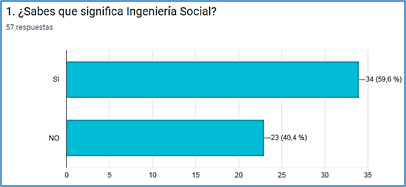 Como complemento, cada pregunta de la encuesta revela información importante, como por ejemplo que el 59.6% de personas tiene conocimiento sobre lo que significa Ingeniería Social, sin embargo, solo el 1.7% se cuestionó el por qué o el motivo de esta encuesta. Véase Figura 11.