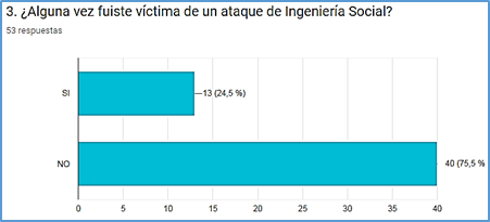 Además, el 66,7% de personas tiene conocimiento de lo que significa Phishing (Figura 12.), y solo el 24,5% piensa que alguna vez ha recibido un ataque de Ingeniería Social (Figura 13.).