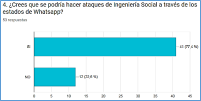 Un dato relevante es que el 77,4% (Vease Figura 14), pensó que sí se podría ejecutar un ataque mediante la publicación de un estado en WhatsApp. En otras palabras, el “enganche” planteado para atraer a los usuarios, tuvo un alto promedio de efectividad.