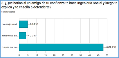 Con esta última pregunta (Figura 15.), se comprobó que muy aparte de que los contactos sean de confianza, el 9,1% indicó que se hubiera enojado si el ataque tenia consecuencias, como robar sus credenciales de alguna forma, pero no sería tan grave. Por otro lado, el 7,3% hubiese cortado toda relación de confianza.