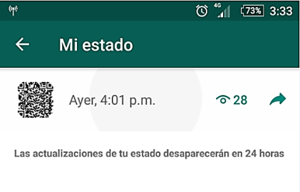 2) Implementación de un código QR en un estado de WhatsApp. Para esto, se configuró un QR Code usando la distribución Kali Linux, y se lo publicó como un estado de WhatsApp, para estimular la curiosidad de los contactos conocidos. Tal como se observa en la Figura 2, este QR Code tiene como leyenda “¿Eres curioso?, Demuéstralo.”. Una vez que el usuario escaneaba el código, se lo direccionaba al blog personal, que incluía el contador de visitas “maligno” del paso anterior. En la Figura 3. se aprecia el número de contactos que revisaron el estado publicado.
