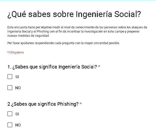 Para realizar esta encuesta se usó la herramienta Google Forms, en la cual se plantearon 5 preguntas, con el objetivo de recolectar información sobre el conocimiento de las personas acerca de los ataques de Ingeniería Social. Véase la Figura 5.