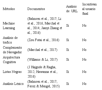 En la Tabla I, se ha clasificado a la literatura encontrada, de acuerdo a los métodos que se usan actualmente para mitigar el problema del Phishing. Además, se han tomado en cuenta solo los trabajos que hagan un análisis de las direcciones URL, sin embargo, estos métodos de detección han tenido sus limitaciones, provocando que los atacantes puedan mejorar y modificar sus estrategias, para así evitar su detección.