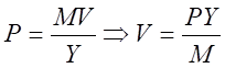 Donde M es igual M2 (oferta monetaria), V (velocidad de circulación del dinero) es igual al volumen de las transacciones que en muchos casos puede ser sustituido por el producto interno bruto en términos reales. La velocidad de circulación del dinero es el ritmo al que circula la cantidad de dinero por la economía cuando los agentes económicos realizan transacciones.