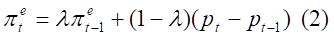 En una hiperinflación, la dinámica de la tasa de interés nominal y la dinámica de inflación esperada son básicamente lo mismo, por lo que la demanda de los individuos para los saldos reales está disminuyendo en la inflación esperada. La segunda parte del modelo de Cagan es que asumió las expectativas de adaptación, lo que significa que la inflación esperada es un promedio ponderado de la inflación actual pt – pt-1 y las expectativas pasadas de inflación.