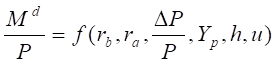 Donde de acuerdo Friedman (1956), tomado Fernández et al (2006), la demanda de los saldos monetarios en término reales es una función que depende de forma inversa del rendimiento (ra y rb) de otros activos financieros alternativos (bonos y acciones) y de la tasa esperada de cambio de precios