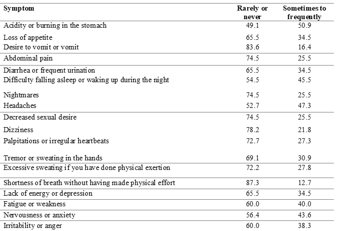 Considerable is the prevalence of stress symptoms (36.4%) that this working population presents (figure 1). According to Seppo Aro symptomatic stress scale, the prevalences for symptoms with higher percentages range from acidity or burning in the stomach, headaches, nervousness or anxiety, fatigue or weakness, irritability or anger, loss of appetite, diarrhea or frequent urination, lack of energy or depression and trembling or sweating in the hands.