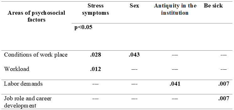 In the relationship results, it is observed that there is only significant correspondence with some of the dimensions of the instrument such as: "workplace conditions" with the symptoms of stress and with the sex variable, the "workload" dimension with the symptoms of stress, "work demands" with seniority in the institution and having some discomfort or illness in the last six months, as well as the "work role" also with the fact of being sick and the "total or global scale of psychosocial factors "with seniority.