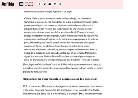 En el marco de los debates por la lucha feminista, Anfibia publicó en 2018 “La menesunda del feminismo”[12], firmado por María Moreno. Es otro texto a cargo de una figura relacionada con la escritura de ficción, y remite a una muestra curada por la misma autora. La enunciación en primera persona replica el estilo narrativo de Moreno: una suerte de incontinencia verbal que a veces rompe la sintaxis para avanzar, desde una “escritura libre”, sobre el recuerdo de personas, personajes, objetos relacionados con su muestra que abarca la historia del feminismo en Argentina. Podría pensarse más cerca de la promoción que de la reflexión, sobre todo porque las marcas textuales así lo indican: es un texto por encargo. Pero en medio de esas condiciones de producción, “La menesunda” permite observar cómo opera una escritura ensayística en formato web. La asociación libre, trasladada a la sintaxis, recupera la esencia del pensamiento íntimo en estado de exposición.