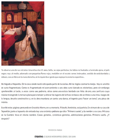 En ese sentido puede pensarse también “Con su sangre escrita”[14], publicado en 2016 y firmado por Tununa Mercado, sobre Sor Juana Inés de la Cruz. Se lo presenta en “Discusión”, aunque fue elaborado como ponencia, luego replicada en la revista. El tema encaja con el perfil de Transas: se trata de un relato en primera sobre la poeta insignia del latinoamericanismo, y de la posición femenina en la literatura. Pero huele anacrónico en la mejor interpretación del término: lejos está, como la obra de Mercado, del valor exaltado del debate coyuntural, como también de una forma genérica definida (las prosas y narraciones de Mercado actúan por fuera de los géneros reconocibles, más allá de su carácter ficcional). En este caso, lo que propicia el soporte es la incorporación de imágenes que refuerzan la percepción intimista, aunque también neutraliza el juego mimético que sirve para la construcción poética.