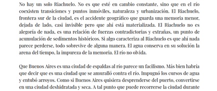 El primer editorial de la revista propone rescatar escrituras y autores que reflexionen sobre la problemática nacional. Abordaje que, en la sección “Ensayos”, se traduce en una consigna que propone a los accidentes fluviales o los cursos de agua como tema, prisma, metáfora o zona de anclaje perceptivo[16]. Los textos son heterogéneos: del singular en primera al plural, algunos incluso son mencionados como prólogos, extractos de libros o ponencias. El caso de Hernán Ronsino, por ejemplo, es significativo porque propone una fusión de elementos narrativos con la reflexión sobre contextos históricos, en una línea coherente con su producción ficcional[17]. Ronsino rescata elementos convencionales del ensayo literario con una voz concisa y reflexiva, sin por eso representar una posición conservadora, ni estética ni teórica: varios espacios en la web han reproducido este perfil, como el blog de Sergio Chejfec (Parábola anterior) durante la primera década del siglo. Ronsino parece ocuparse sólo de literatura, como en “La casa y el violín” o “La invención del otro río”[18], pero su escritura se vuelve excusa para mostrar el tránsito de la lectura (la experiencia propia) a la ficción y luego al análisis social. Para esto evoca obras, entornos específicos (el territorio ribereño) y cadencias a partir de autores como Saer, Lugones o Conti.