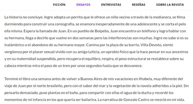 Cito estos ejemplos para reforzar una primera evidencia: dentro de la heterogeneidad de escrituras en la web, el registro ensayístico de coyuntura exige un repensar del género para comprender las rutinas actuales de lectura y navegación. ¿Qué hace, hoy, funcionar a los distintos tipos de ensayo, y qué los ata a su “pasado”? Para complejizar aún más la tensión entre problemas, reflexiones y velocidades, las variantes en las que los fueros literarios toman relieve también están presentes en revistas atentas a la coyuntura. Y en esos casos sí toma protagonismo la firma como elemento estructurante del género.