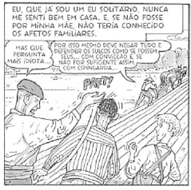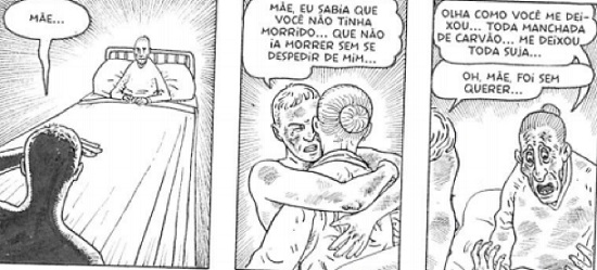 Voltando à passagem do sonho com a mãe, no primeiro dos últimos três quadros da página, o personagem ainda cobre os olhos com a mão, incomodado com a luz, mas já consegue visualizar a idosa deitada em uma cama. Ele chama: “Mãe...”. Na sequência, a claridade os envolve, eles se abraçam e vemos afinal o rosto de Antonio: “Mãe, eu sabia que você não tinha morrido... Que não ia morrer sem se despedir de mim...”. O alívio quanto a sua própria ausência no momento dessa morte se revela no abraço forte na mãe, na lágrima que ele solta. No último quadro, no entanto, a idosa reclama: “Olha como você me deixou... Toda manchada de carvão... Me deixou toda suja...”. E ele responde: “Oh, mãe, foi sem querer...”.